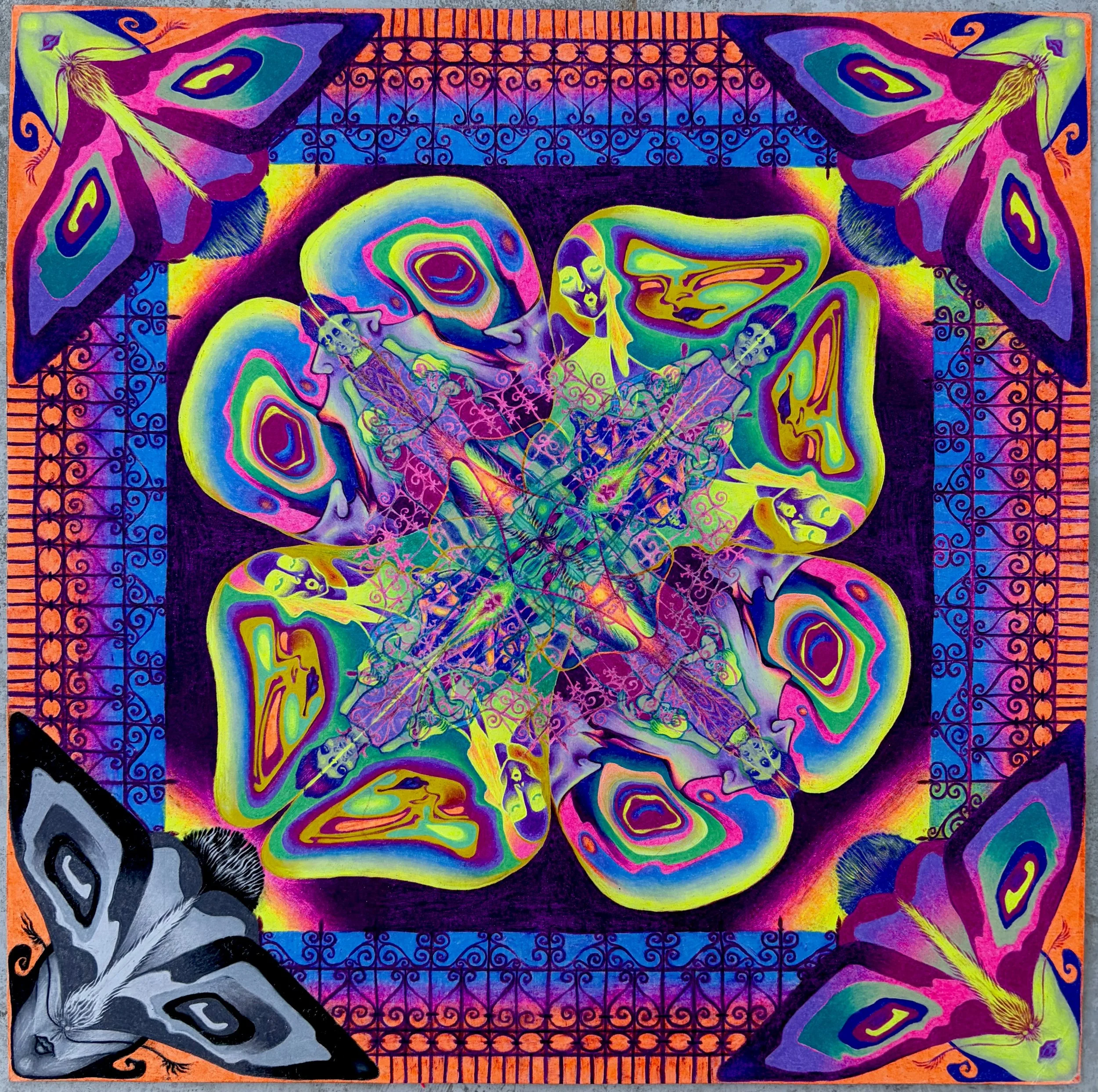 The center of the scarf features four moths, four mothers and eight little girls, four party girls, four ladies awakening the morning after, four pairs of lips kissing, four psychedelic faces, and a ornate iron gate.